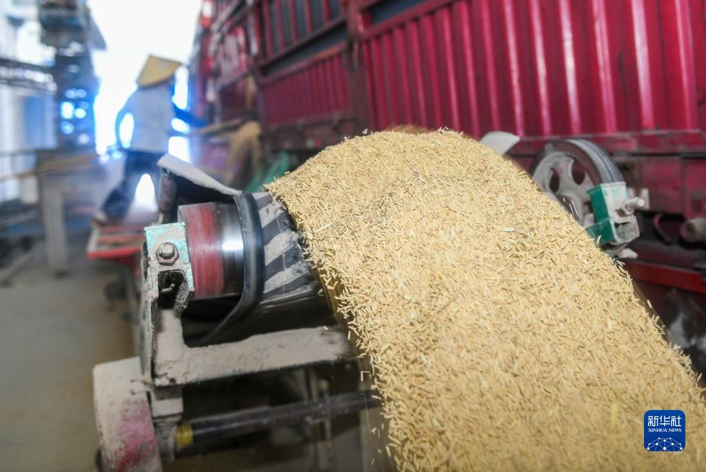 9月24日,在湖南省永州市道縣梅花鎮(zhèn)一家糧食收購企業(yè),工作人員將稻谷卸載入庫。
