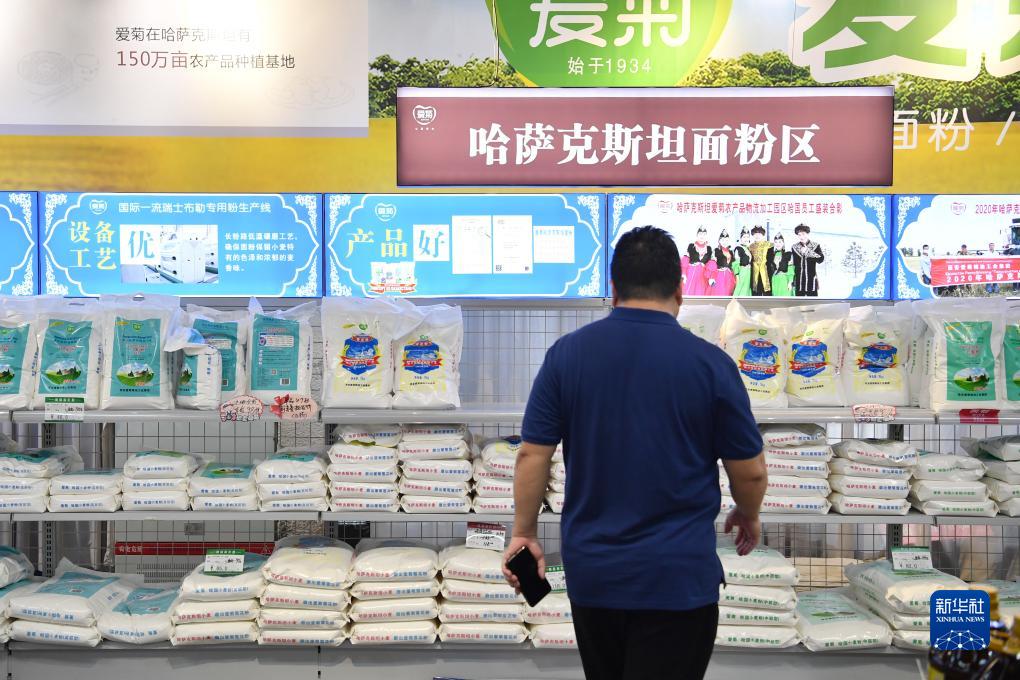 9月22日,在西安國際港站附近一家超市內,顧客選購中歐班列長安號運回的進口面粉。