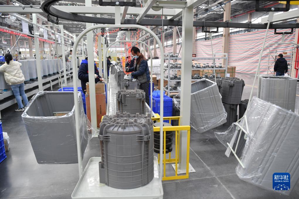 在西安國際港站附近的一家家電生產企業內,工人在生產線上組裝洗衣機(2月22日攝)。