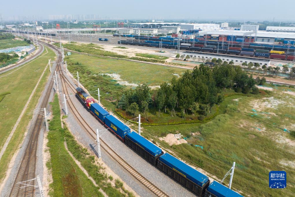 中歐班列長安號駛離西安國際港站(9月7日攝,無人機照片)。