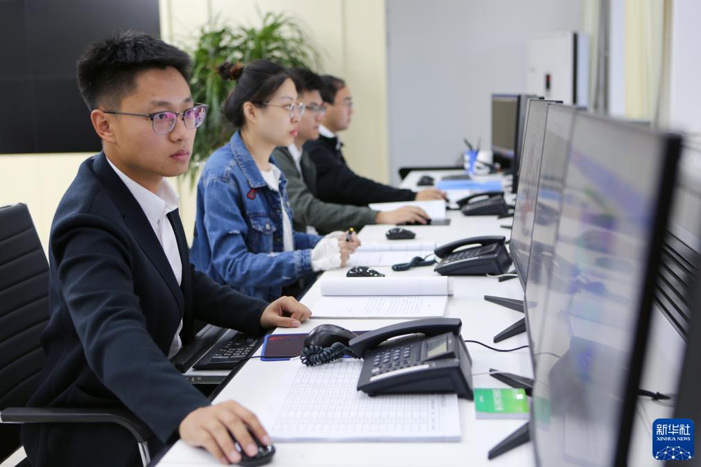 在富錦市氣象局,四名青年氣象員在整理分析數據、提供農用天氣預報信息(9月22日攝)。