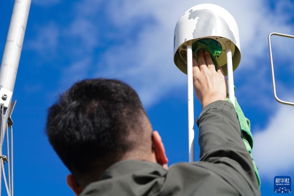 在富錦市現代農業萬畝水稻科技示范園實驗基地,氣象員王國泰在維護農業氣象觀測儀器(9月22日攝)。