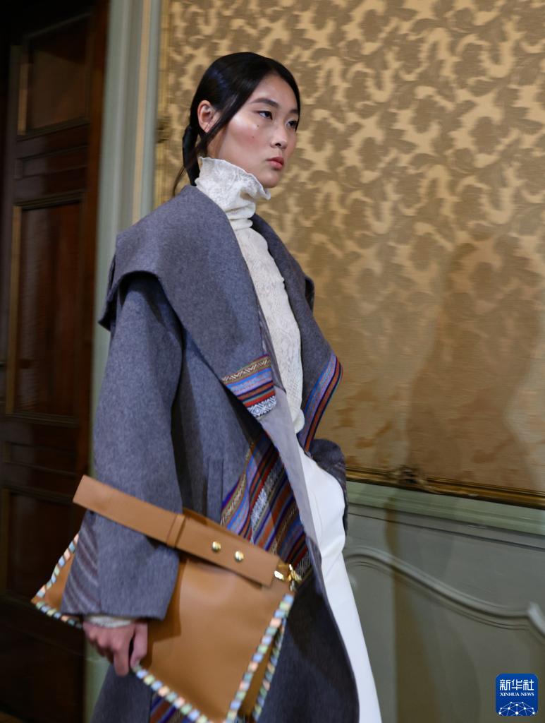 9月23日,模特在意大利米蘭時(shí)裝周上展示楚雄彝繡女裝。