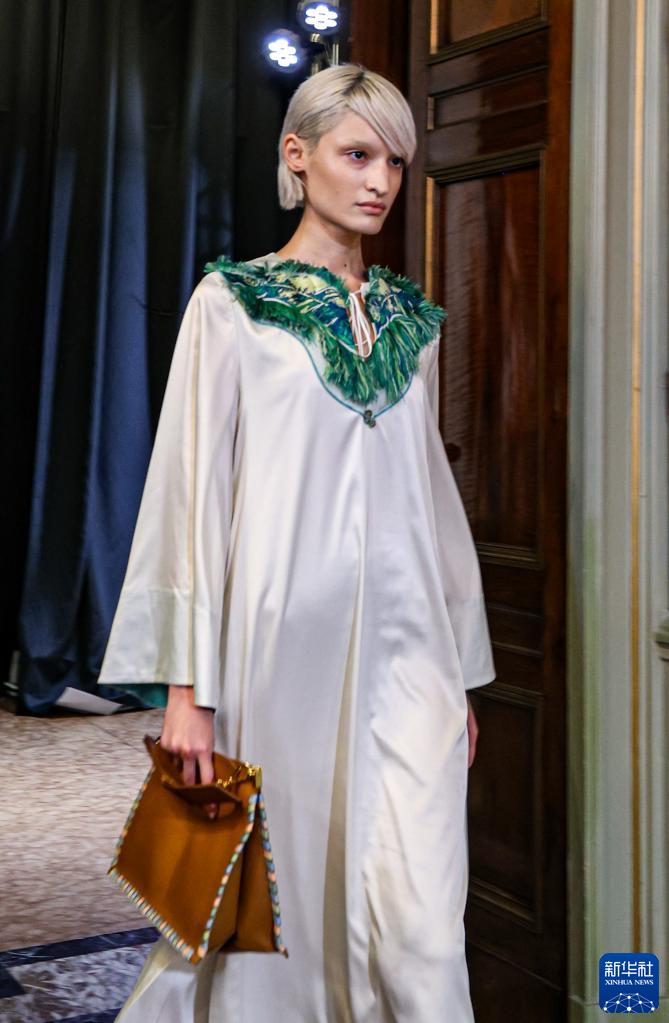 9月23日,模特在意大利米蘭時裝周上展示楚雄彝繡女裝。
