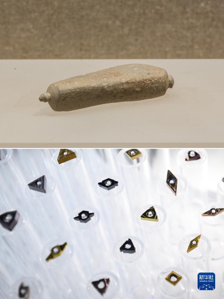 拼版照片:上圖為安徽省馬鞍山市含山縣的凌家灘遺址出土的石鉆(凌家灘遺址管理處供圖);下圖為2023世界制造業(yè)大會(huì)上展出的硬質(zhì)合金整體數(shù)控刀粒(9月23日攝,新華社記者張端攝)。