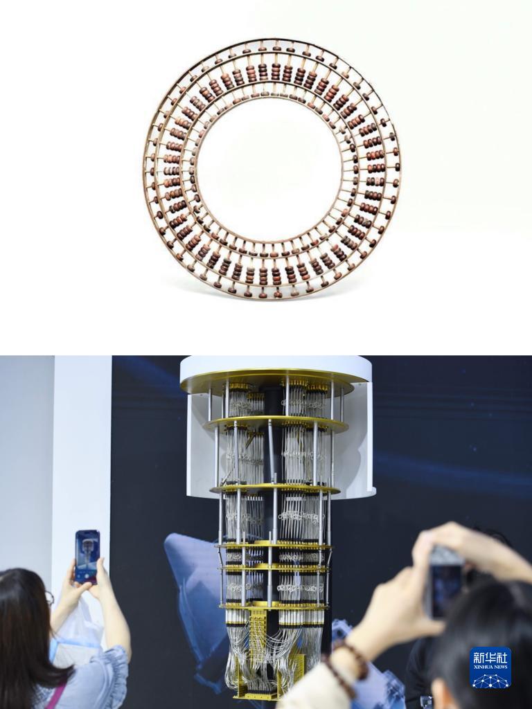 拼版照片:上圖為明代銅圓八卦算盤(安徽黃山程大位珠算博物館供圖);下圖為2023世界制造業大會上展出的“祖沖之號”超導量子計算機模型(9月21日攝,新華社記者周牧攝)。