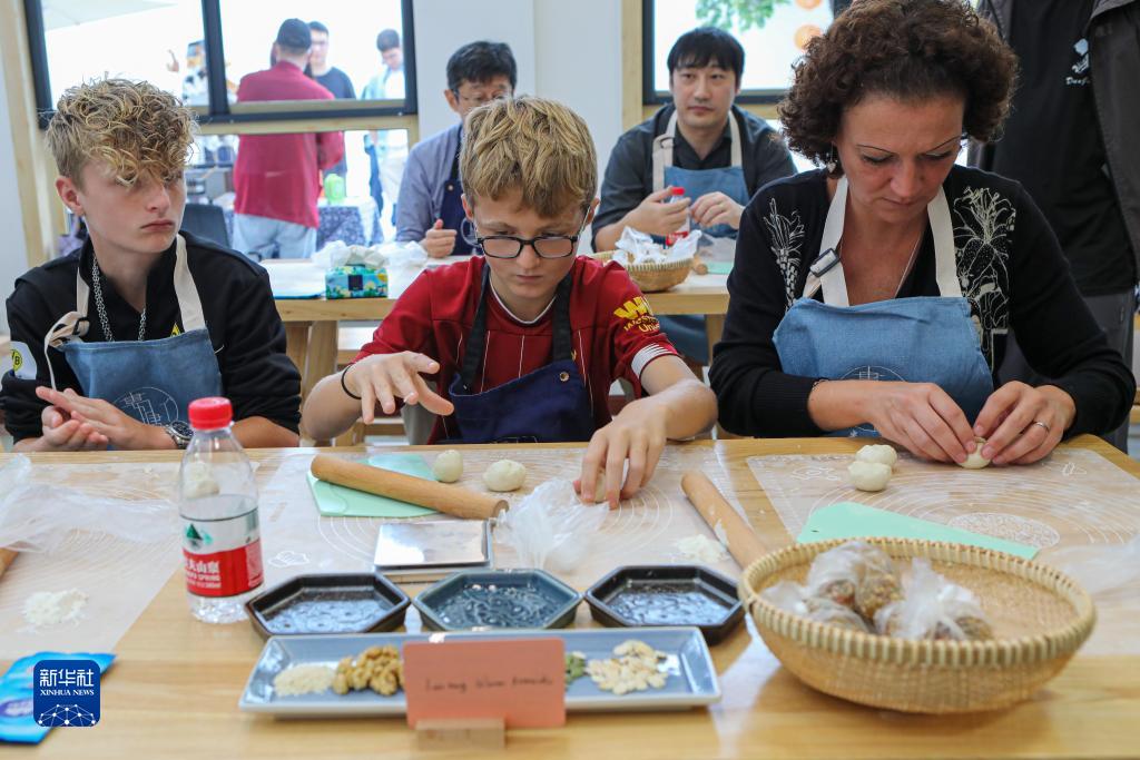 9月24日,在婁塘塌餅非遺傳承館,外國友人體驗制作月餅。