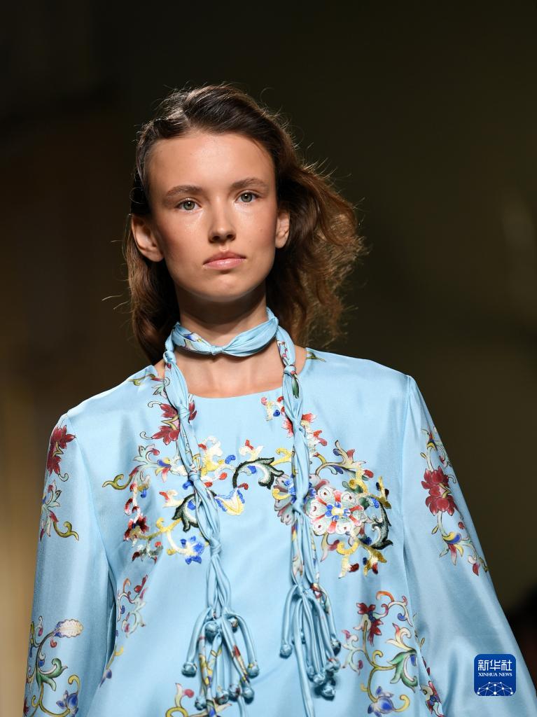 9月24日,模特在意大利米蘭時裝周上展示含有貴州苗繡元素的設計時裝。