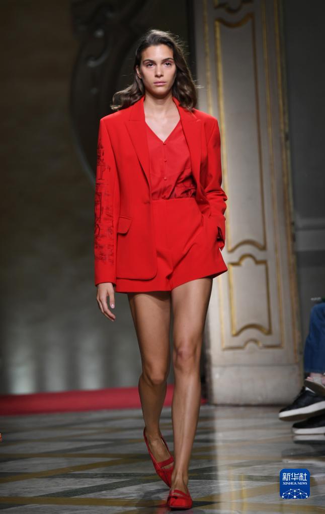 9月24日,模特在意大利米蘭時裝周上展示含有貴州苗繡元素的設計時裝。
