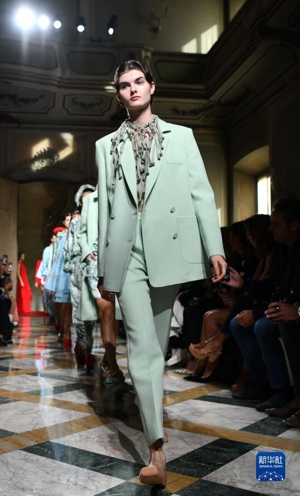 9月24日,模特在意大利米蘭時裝周上展示含有貴州苗繡元素的設(shè)計時裝。