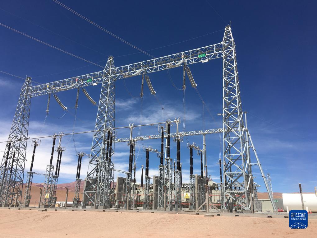 這是2021年11月22日在阿根廷胡胡伊省高查瑞光伏電站拍攝的升壓站高壓線路。