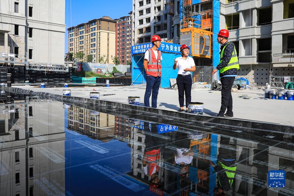 中鐵北京工程局集團(tuán)雄安指揮部高級(jí)工程師梁璐(中)在雄安新區(qū)容西片區(qū)一處安置房建設(shè)現(xiàn)場(chǎng)勘察建筑防水情況(9月21日攝)。
