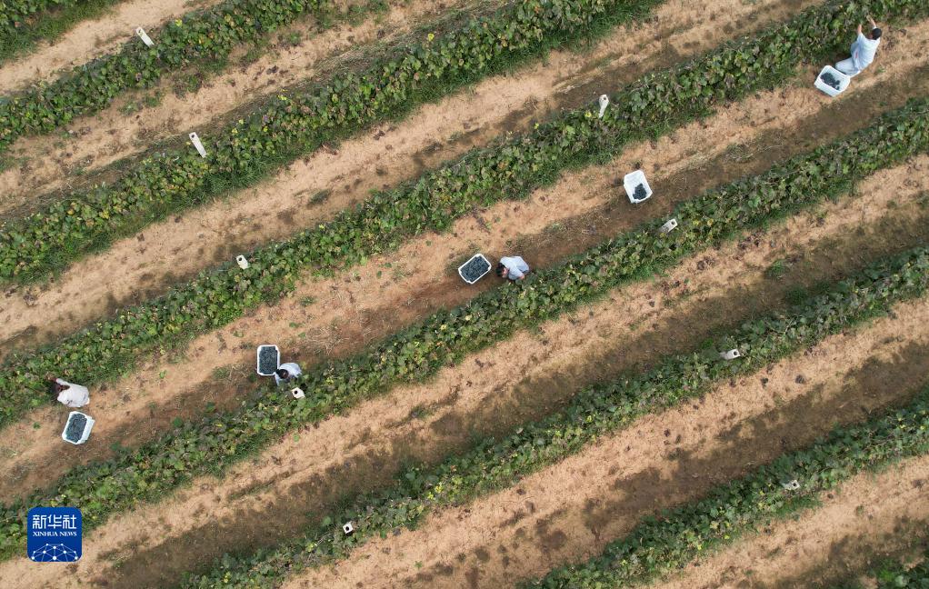 9月25日,河北省盧龍縣盧龍鎮一家葡萄酒企業的工人在釀酒葡萄種植基地采摘釀酒葡萄(無人機照片)。