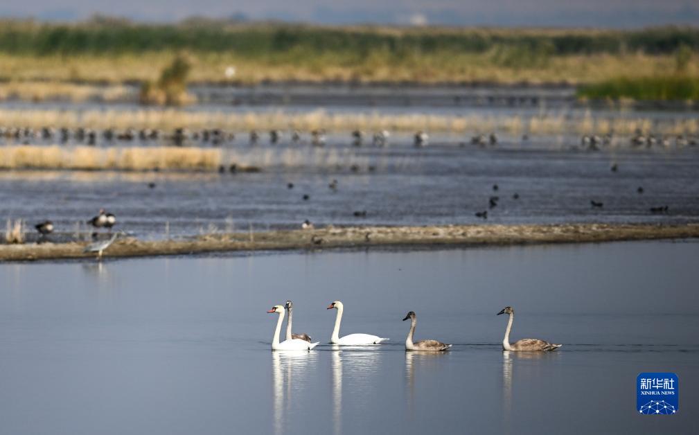 新時代中國調研行·黃河篇丨疣鼻天鵝在烏梁素海帶娃