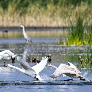 烏梁素海,意為“紅柳湖”,位于黃河“幾字彎”頂部,是黃河流域最大的湖泊濕地。近年來,隨著烏梁素海生態治理力度不斷加大,生態成果也不斷顯現。各類候鳥在這里安了家,本來前往西伯利亞的疣鼻天鵝也在烏梁素海產卵孵化生活,烏梁素海成為我國最大的疣鼻天鵝繁殖基地。近日,在烏梁素海湖面上,成年疣鼻天鵝帶領幼鳥練習飛翔,準備為過冬前的長途遷徙做準備。