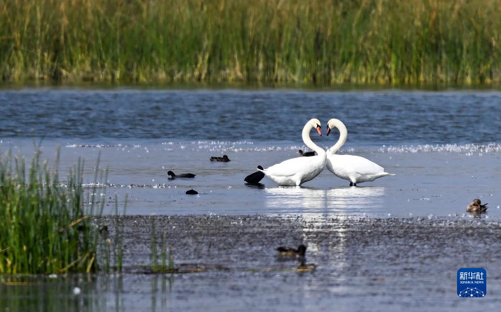 烏梁素海,意為“紅柳湖”,位于黃河“幾字彎”頂部,是黃河流域最大的湖泊濕地。近年來,隨著烏梁素海生態治理力度不斷加大,生態成果也不斷顯現。各類候鳥在這里安了家,本來前往西伯利亞的疣鼻天鵝也在烏梁素海產卵孵化生活,烏梁素海成為我國最大的疣鼻天鵝繁殖基地。近日,在烏梁素海湖面上,成年疣鼻天鵝帶領幼鳥練習飛翔,準備為過冬前的長途遷徙做準備。