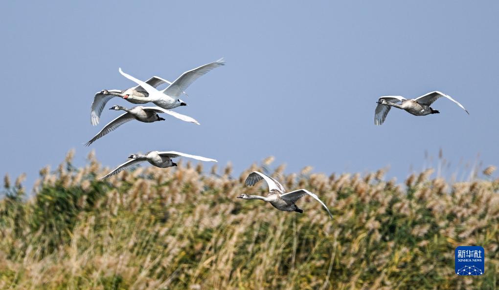 烏梁素海,意為“紅柳湖”,位于黃河“幾字彎”頂部,是黃河流域最大的湖泊濕地。近年來(lái),隨著烏梁素海生態(tài)治理力度不斷加大,生態(tài)成果也不斷顯現(xiàn)。各類候鳥(niǎo)在這里安了家,本來(lái)前往西伯利亞的疣鼻天鵝也在烏梁素海產(chǎn)卵孵化生活,烏梁素海成為我國(guó)最大的疣鼻天鵝繁殖基地。近日,在烏梁素海湖面上,成年疣鼻天鵝帶領(lǐng)幼鳥(niǎo)練習(xí)飛翔,準(zhǔn)備為過(guò)冬前的長(zhǎng)途遷徙做準(zhǔn)備。