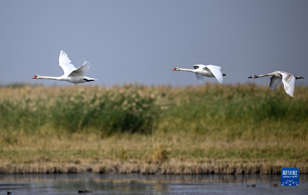 烏梁素海,意為“紅柳湖”,位于黃河“幾字彎”頂部,是黃河流域最大的湖泊濕地。近年來(lái),隨著烏梁素海生態(tài)治理力度不斷加大,生態(tài)成果也不斷顯現(xiàn)。各類候鳥在這里安了家,本來(lái)前往西伯利亞的疣鼻天鵝也在烏梁素海產(chǎn)卵孵化生活,烏梁素海成為我國(guó)最大的疣鼻天鵝繁殖基地。近日,在烏梁素海湖面上,成年疣鼻天鵝帶領(lǐng)幼鳥練習(xí)飛翔,準(zhǔn)備為過(guò)冬前的長(zhǎng)途遷徙做準(zhǔn)備。