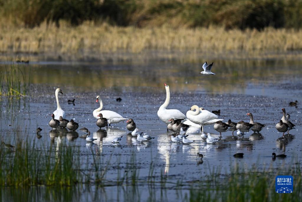 烏梁素海,意為“紅柳湖”,位于黃河“幾字彎”頂部,是黃河流域最大的湖泊濕地。近年來,隨著烏梁素海生態(tài)治理力度不斷加大,生態(tài)成果也不斷顯現(xiàn)。各類候鳥在這里安了家,本來前往西伯利亞的疣鼻天鵝也在烏梁素海產(chǎn)卵孵化生活,烏梁素海成為我國最大的疣鼻天鵝繁殖基地。近日,在烏梁素海湖面上,成年疣鼻天鵝帶領幼鳥練習飛翔,準備為過冬前的長途遷徙做準備。