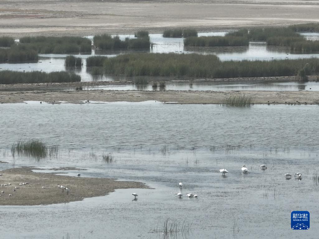 成群的疣鼻天鵝在烏梁素海覓食(無(wú)人機(jī)照片,9月14日攝)。