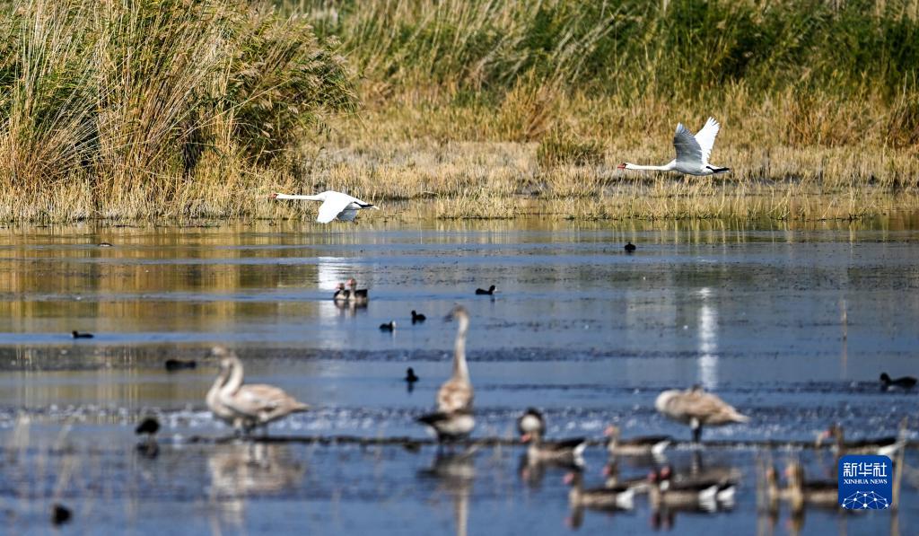 烏梁素海,意為“紅柳湖”,位于黃河“幾字彎”頂部,是黃河流域最大的湖泊濕地。近年來,隨著烏梁素海生態治理力度不斷加大,生態成果也不斷顯現。各類候鳥在這里安了家,本來前往西伯利亞的疣鼻天鵝也在烏梁素海產卵孵化生活,烏梁素海成為我國最大的疣鼻天鵝繁殖基地。近日,在烏梁素海湖面上,成年疣鼻天鵝帶領幼鳥練習飛翔,準備為過冬前的長途遷徙做準備。