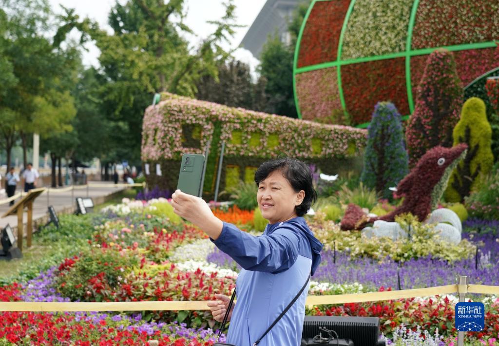 9月25日,一名女士在北京西單一處花壇前拍照留念。