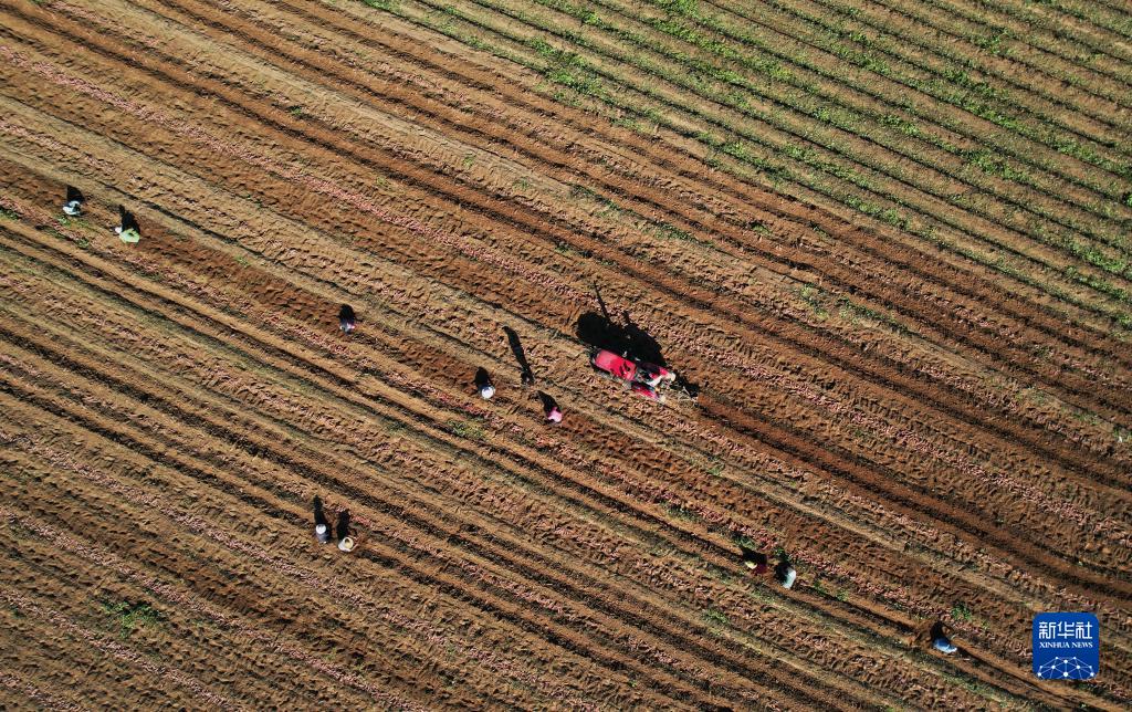 9月25日,河北省盧龍縣盧龍鎮(zhèn)一家紅薯種植合作社的社員在收獲紅薯(無人機(jī)照片)。