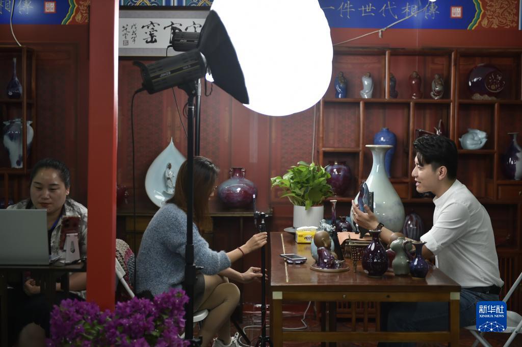 9月25日,工作人員在禹州市神垕鈞瓷工業文化園內舉辦的中國鈞瓷暨美術陶瓷博覽會現場進行直播,推介鈞瓷產品。