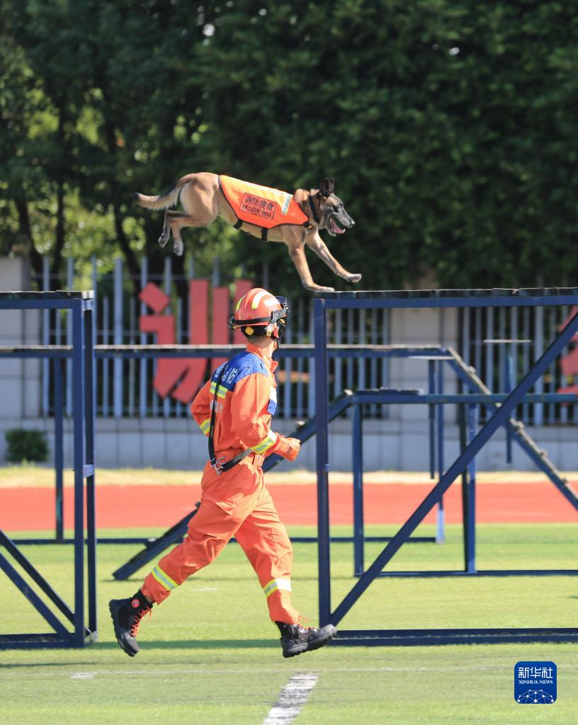 9月25日,在2023年福建省消防行業職業技能競賽現場,消防員參加“搜救犬救援”項目的比拼。