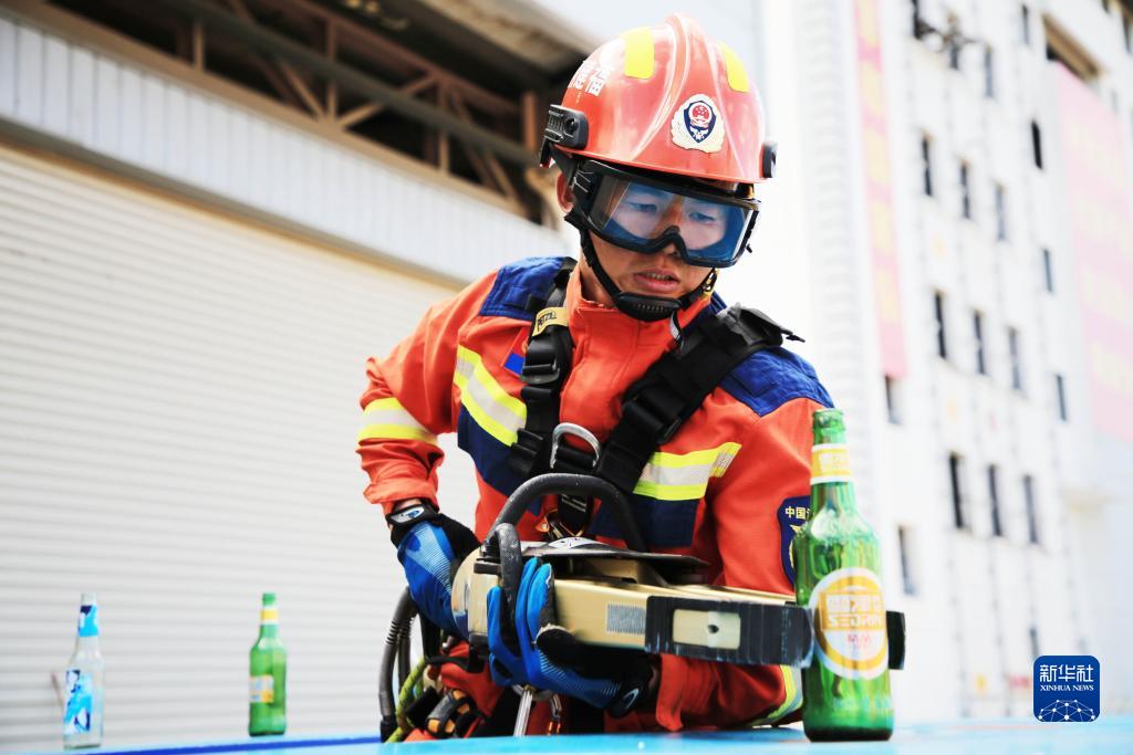9月25日,在2023年福建省消防行業(yè)職業(yè)技能競(jìng)賽現(xiàn)場(chǎng),消防員在“攻堅(jiān)技巧”項(xiàng)目中操作液壓擴(kuò)張器轉(zhuǎn)移啤酒瓶。