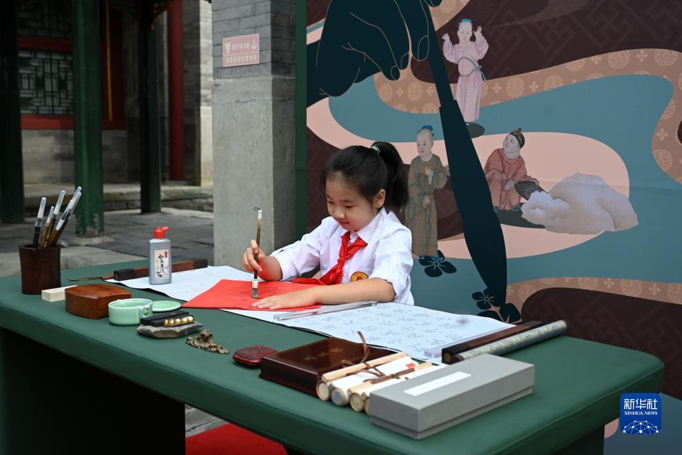9月25日,小學生在展覽現場練習毛筆字。