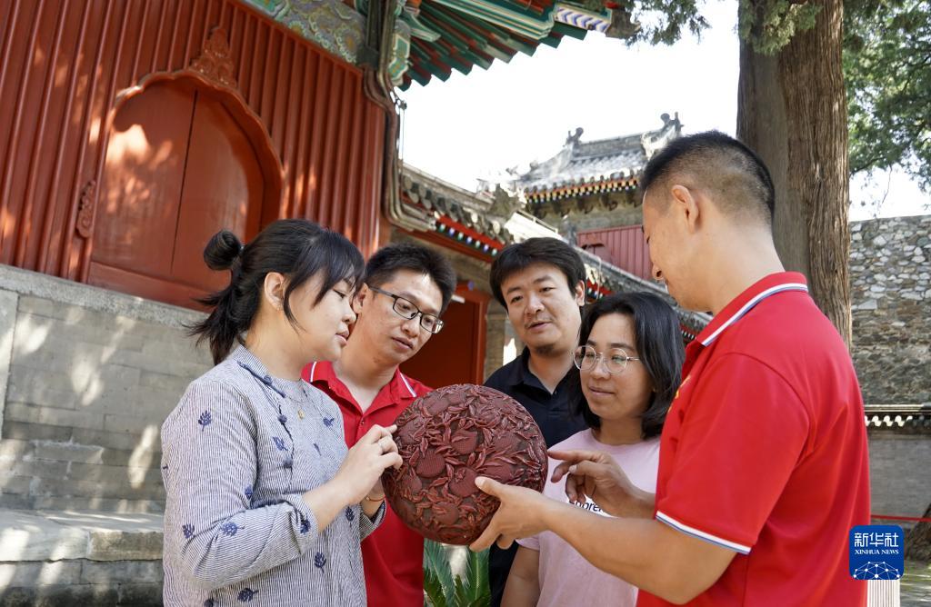 海燕在和同事一起研究古代雕漆作品的胎底制作技術和紋飾雕刻技藝(9月21日攝)。