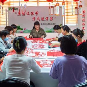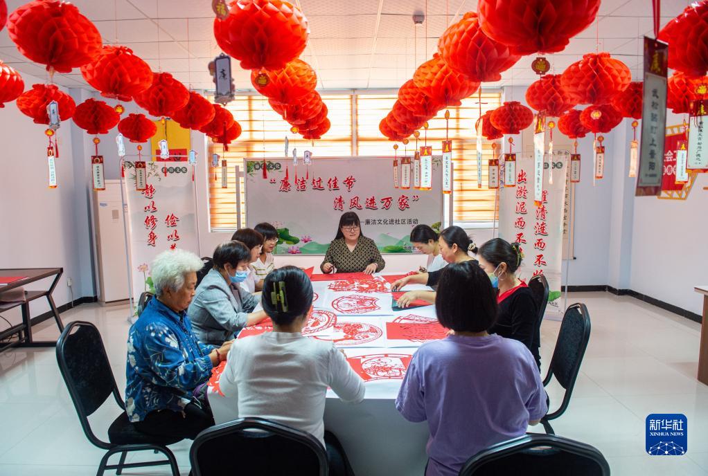 9月26日,在河北省棗強縣河西社區,黨員干部和居民共同制作廉政剪紙作品。