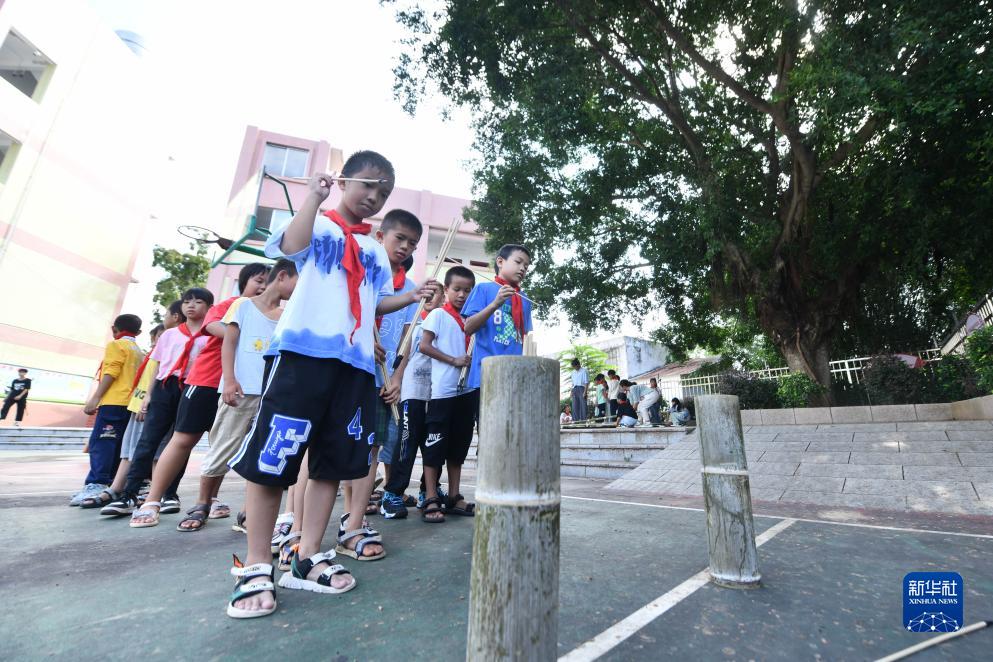 9月26日,在梧州市長洲區古道小學,學生們在大課間練習投壺。