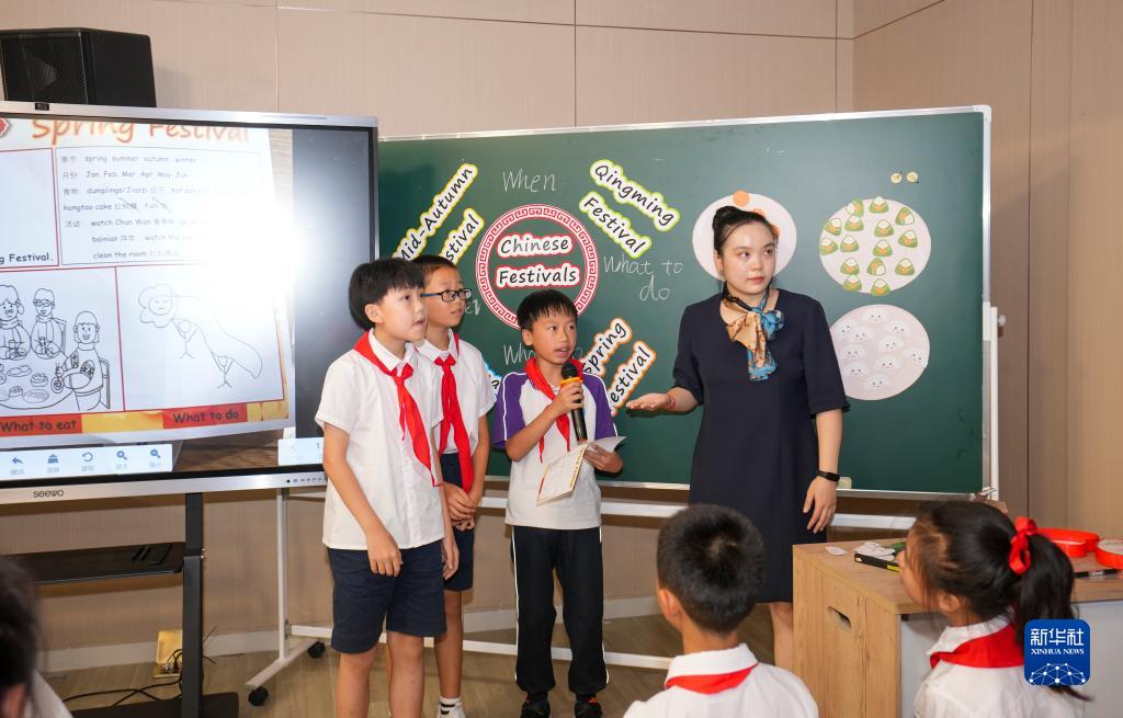9月26日,在重慶鐵路小學英語教學交流課上,城口縣蓼子鄉第一中心小學的一名學生代表(左三)和鐵路小學的學生們一起進行課堂教學互動。