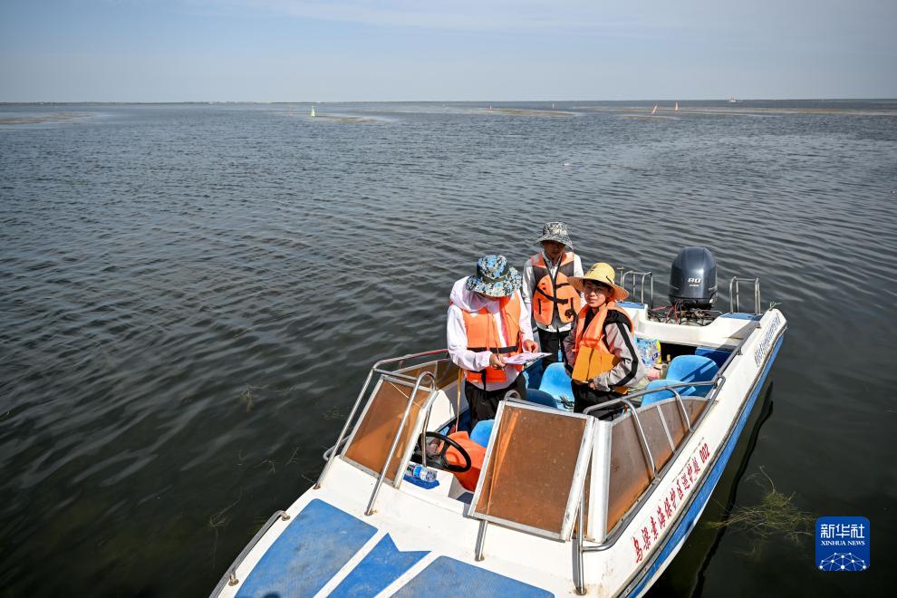 9月15日,在烏梁素海湖面上,武蓉(右一)、馮琛(左一)和劉瑩慧準備乘坐快艇去采集湖水樣本。
