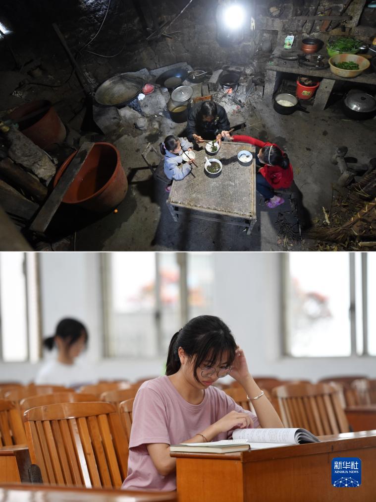 這是一張拼版照片,上圖為:在廣西都安瑤族自治縣拉烈鎮崇業村弄后屯,藍曉萍(右)和妹妹藍云萍(左)、父親藍啟站在吃早飯(2015年4月14日攝);下圖為:在廣西南寧師范大學,藍曉萍在教室里學習(2023年9月26日攝)。