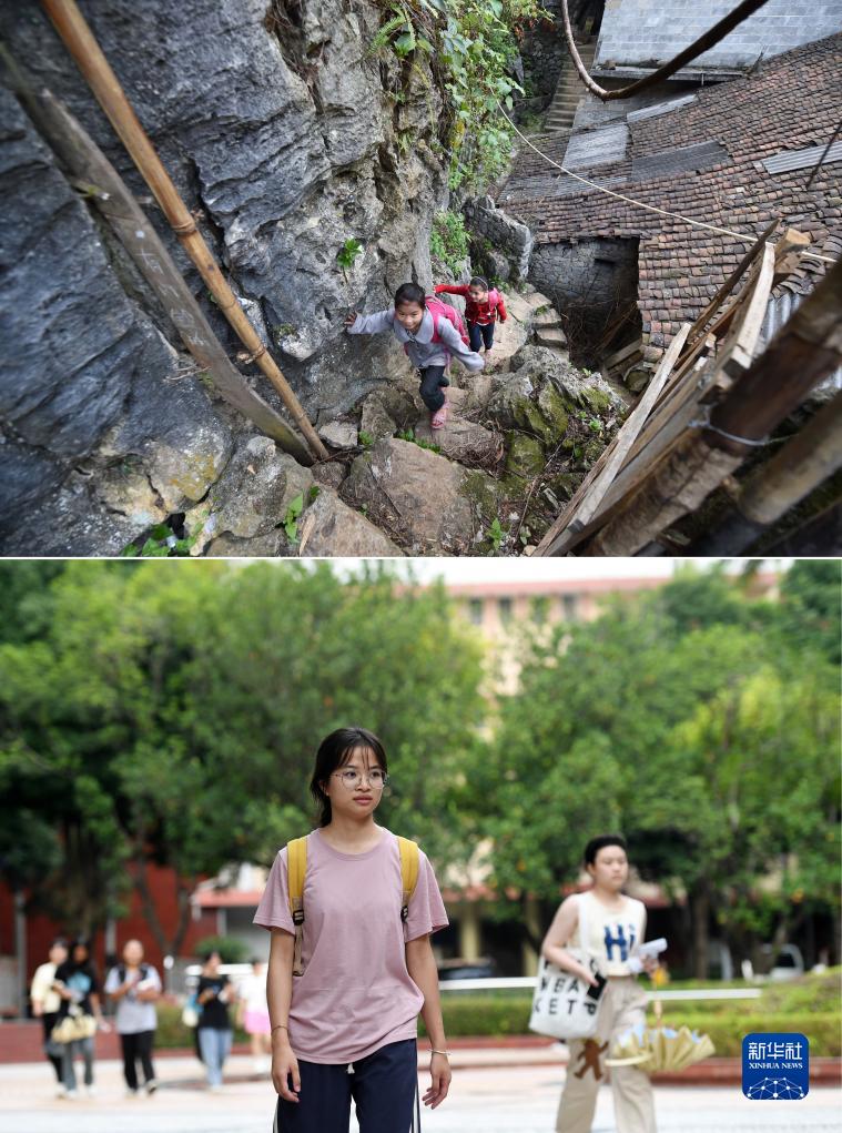 這是一張拼版照片,上圖為:在廣西都安瑤族自治縣拉烈鎮(zhèn)崇業(yè)村弄后屯,藍(lán)曉萍(后)和妹妹藍(lán)云萍走在上學(xué)的路上(2015年4月14日攝);下圖為:在廣西南寧師范大學(xué),藍(lán)曉萍走在校園里(2023年9月26日攝)。