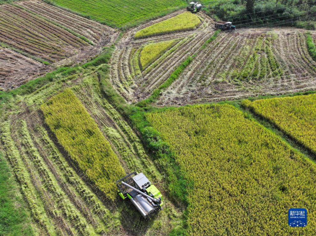 金秋時(shí)節(jié),湖南省瀏陽(yáng)市沿溪鎮(zhèn)種植的中稻迎來(lái)收獲季,當(dāng)?shù)剞r(nóng)民搶抓農(nóng)時(shí)收割水稻,稻田里一派繁忙景象。