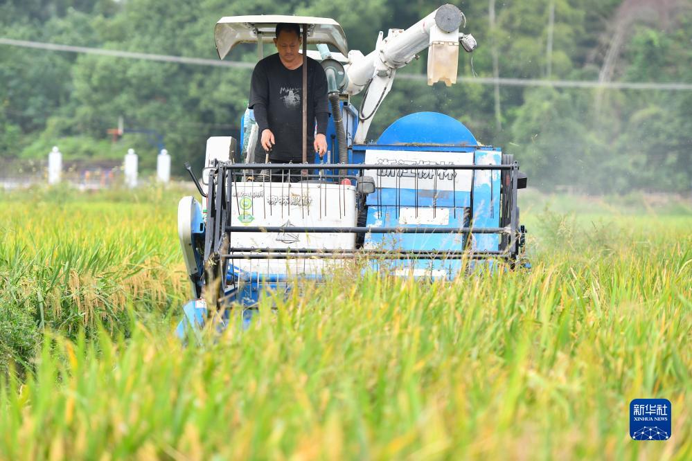 金秋時節,湖南省瀏陽市沿溪鎮種植的中稻迎來收獲季,當地農民搶抓農時收割水稻,稻田里一派繁忙景象。