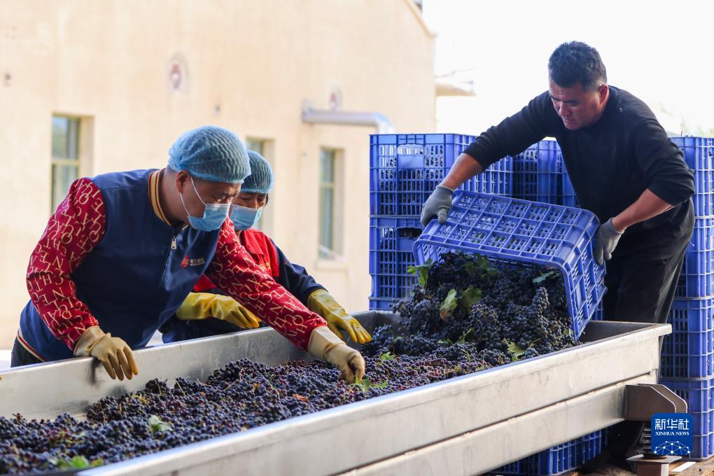 9月26日,在新疆吐魯番市鄯善縣樓蘭酒莊,工人通過(guò)震蕩機(jī)篩選釀酒葡萄。