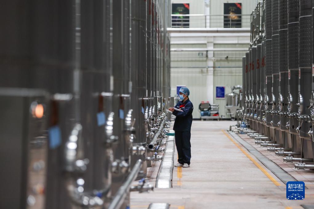 9月26日,在新疆吐魯番市鄯善縣樓蘭酒莊,釀造工在生產(chǎn)車間巡查。