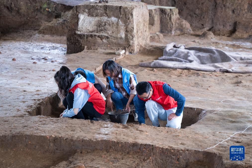9月27日,湖北省文物考古研究院和天門市博物館的考古工作人員在石家河遺址的譚家嶺發掘現場進行考古工作。