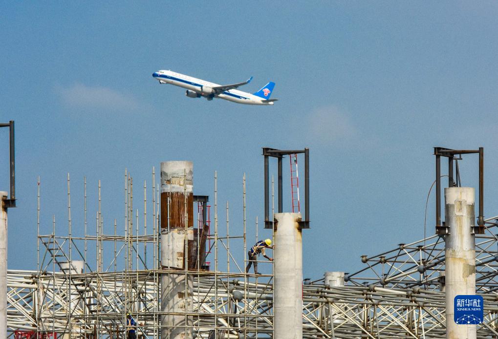 9月27日,一架飛機從廣州白云國際機場T3航站樓施工現(xiàn)場上空飛過。