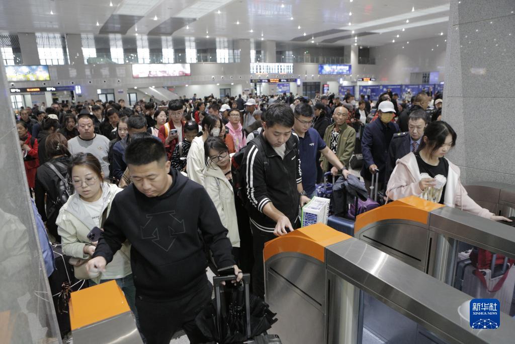 9月27日,旅客在黑龍江佳木斯站排隊進站乘車。
