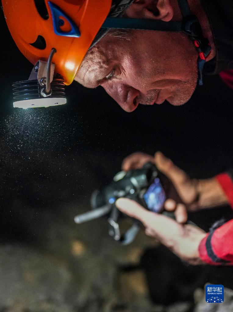 意大利專家在雙河洞一處支洞中進行科考(9月24日攝)。