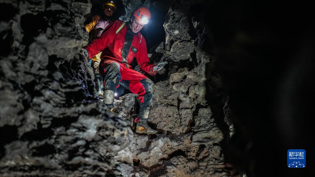 意大利專家和貴州省山地資源研究所科考隊員在雙河洞一處支洞中行進(9月24日攝)。