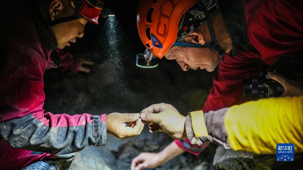 意大利專家和貴州省山地資源研究所科考隊員在雙河洞一處支洞中進行科考(9月24日攝)。