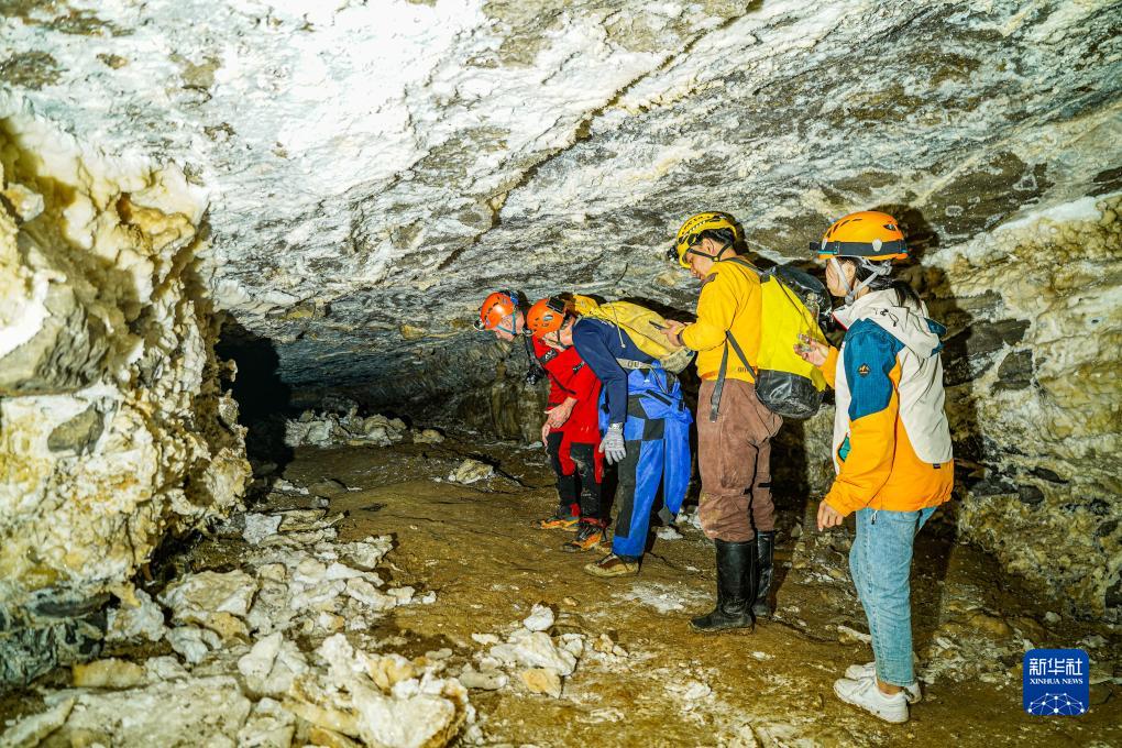 意大利專家和貴州省山地資源研究所科考隊員在雙河洞一處支洞中進行科考(9月22日攝)。