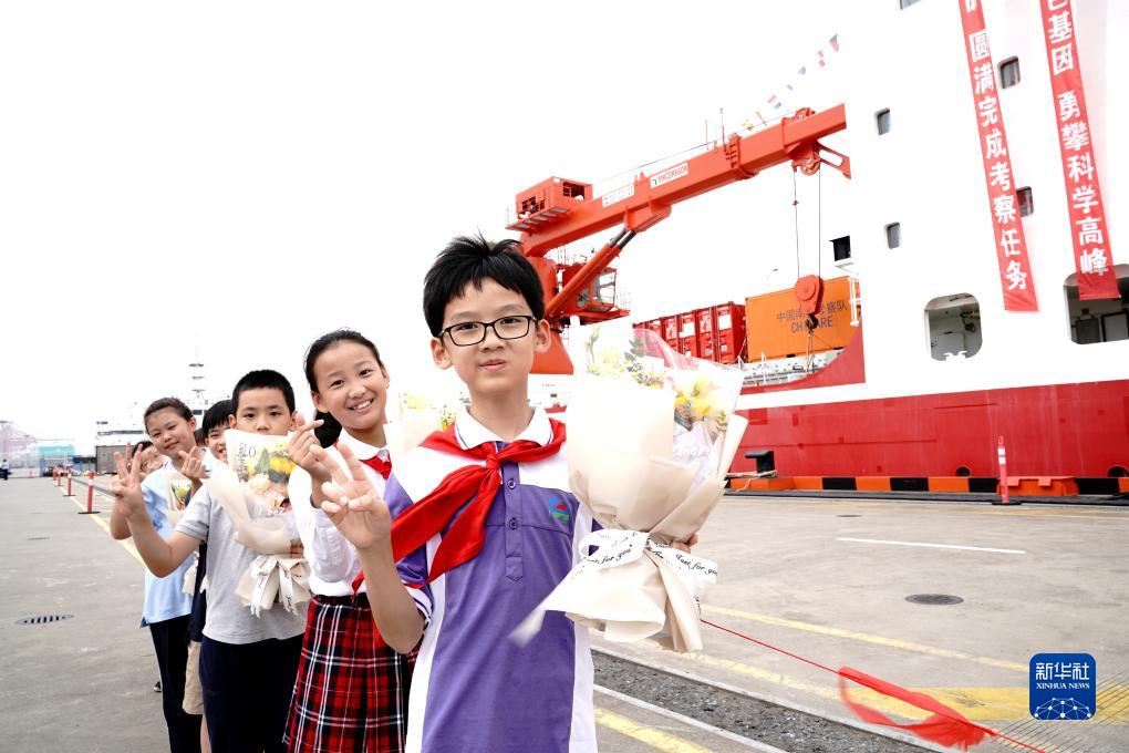 9月27日,小朋友們在碼頭歡迎中國第13次北冰洋科學考察隊凱旋。
